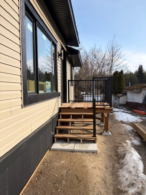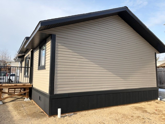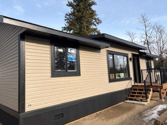 This Custom Design home is located in Osprey Manufactured Home Park in Pritchard, BC. This is a 27′ x 60′ home with 3 bedrooms and 2 bathrooms. The exterior is black and grey and interior has vaulted ceilings.